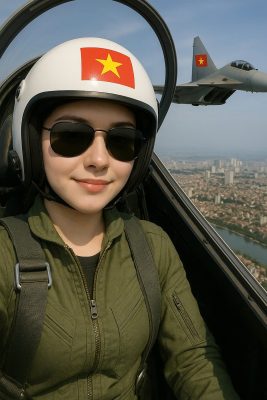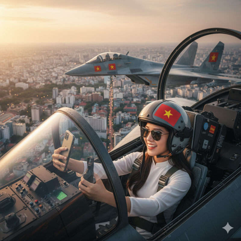 Lệnh mẫu: Ghép ảnh mặt tôi và tạo cho tôi một tấm ảnh Selfie trên buồng lái của máy bay Su-30MK2, tôi có đeo kính mát, sau buồng kính của máy bay là Thành phố Hà Nội kèm với một chiếc máy bay nữa của đồng đội. Máy bay đồng đội có cờ Việt Nam trên thân máy bay. Mũ bảo hiểm in cờ Việt Nam.