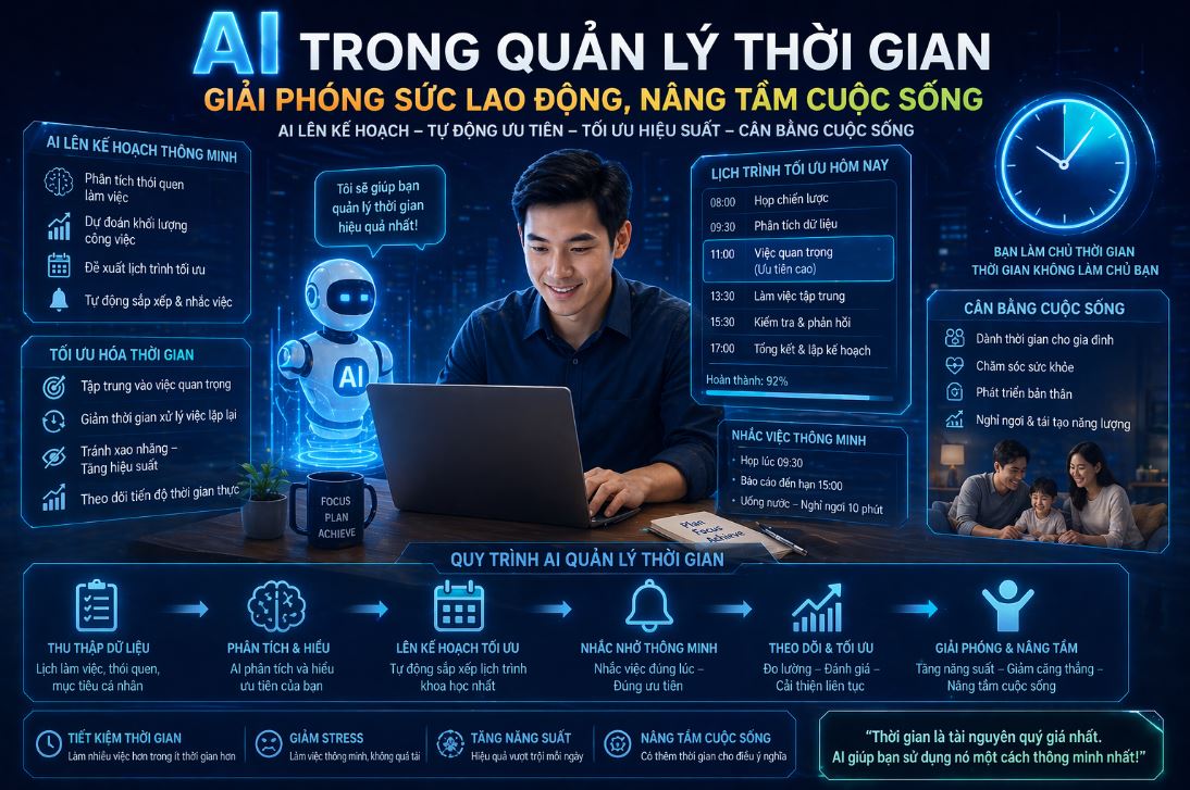 Nỗi ám ảnh lớn nhất của các chủ SME là “không có đủ thời gian”. Chúng ta thường bị cuốn vào những việc vặt vãnh, lặp đi lặp lại mà quên mất việc hoạch định chiến lược hay chăm sóc bản thân. Năm 2026, AI không chỉ là công cụ làm việc, nó là một “kiến trúc sư thời gian” thấu cảm, giúp bạn giành lại những giờ phút quý báu.