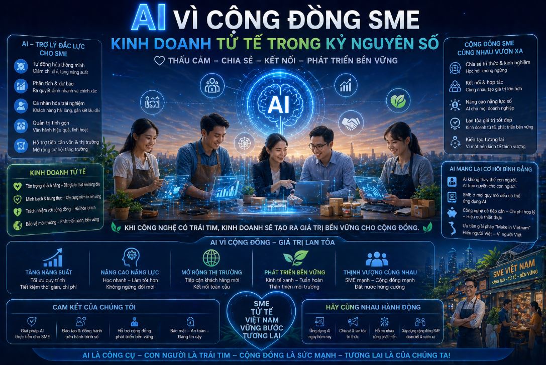 Trong xu thế mới, AI vì cộng đồng SME đang trở thành kim chỉ nam cho các doanh nghiệp nhỏ. Kinh doanh ngày nay không chỉ là bài toán về doanh thu và lợi nhuận. Khách hàng luôn ưu tiên những thương hiệu biết quan tâm đến các vấn đề chung. Một doanh nghiệp thấu cảm là nơi dùng công nghệ để phụng sự cộng đồng.