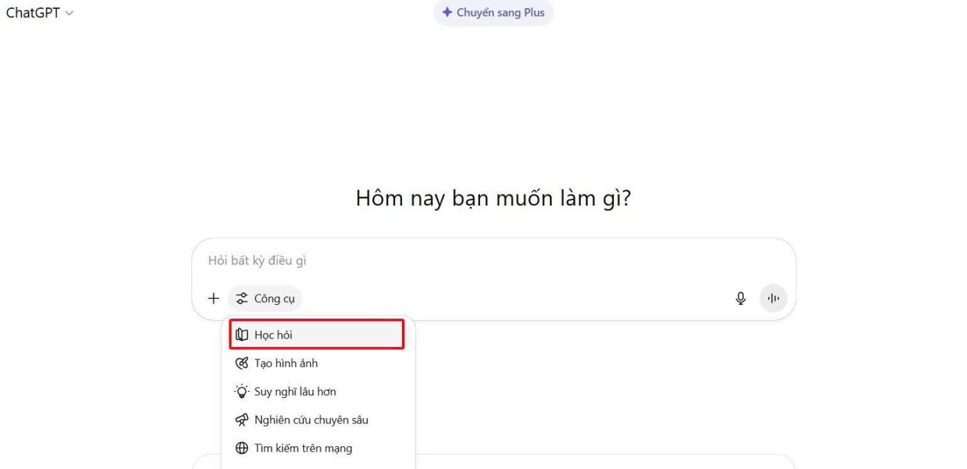 Bấm vào công cụ hoặc tìm kiếm chế độ “Học hỏi” (Learn/Study Mode) trong giao diện.