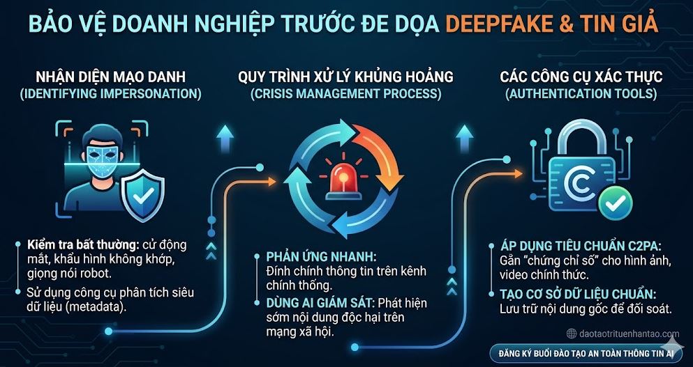 [Image: A professional diagram, structured horizontally, titled ‘BẢO VỆ DOANH NGHIỆP TRƯỚC ĐE DỌA DEEPFAKE & TIN GIẢ’. It outlines three key sections with icons and process text on a clean digital grid background: 1. ‘NHẬN DIỆN MẠO DANH (IDENTIFYING IMPERSONATION)’, 2. ‘QUY TRÌNH XỬ LÝ KHỦNG HOẢNG (CRISIS MANAGEMENT PROCESS)’, and 3. ‘CÁC CÔNG CỤ XÁC THỰC (AUTHENTICATION TOOLS)’. The diagram uses professional blues, cyans, oranges, and Verified/Secure icons with glowing edges.]
