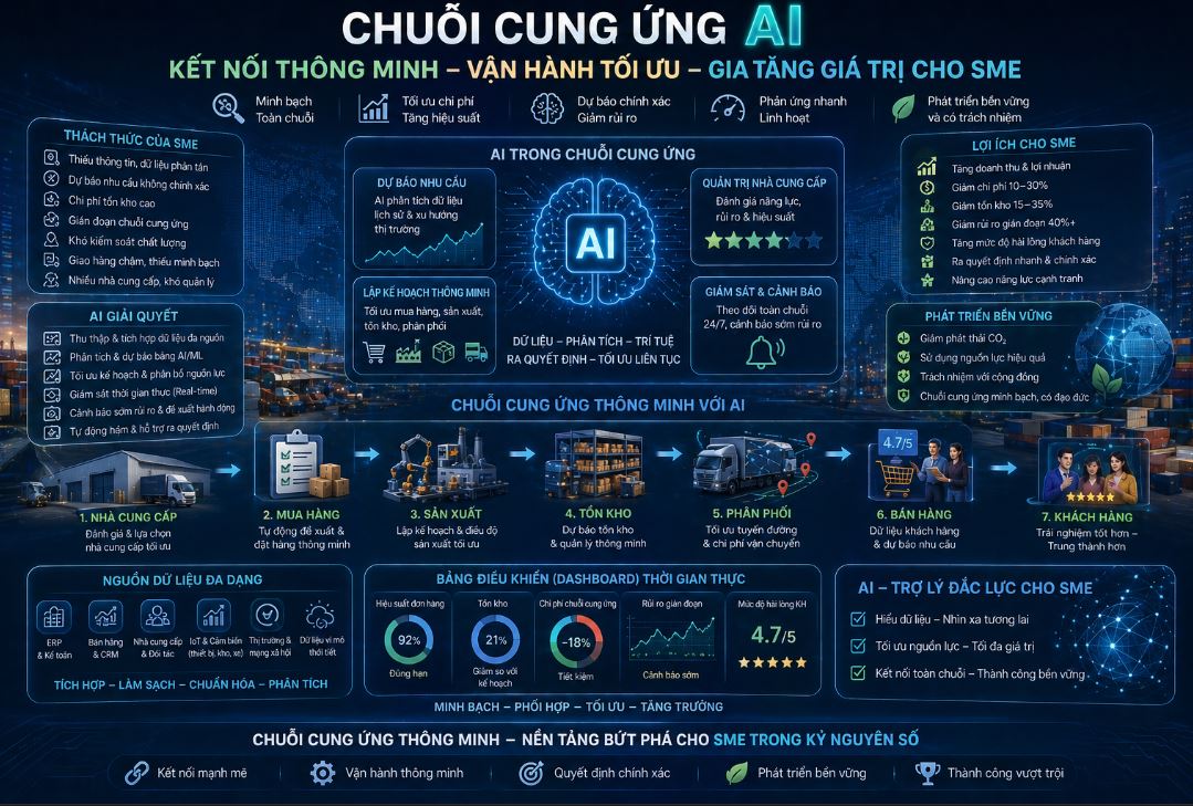 Trong kinh doanh hiện đại, Chuỗi cung ứng AI là yếu tố then chốt để SME phát triển bền vững. Một quy trình từ nguyên liệu đến tay người tiêu dùng cần sự liền mạch và minh bạch. Doanh nghiệp thấu cảm là nơi biết trân trọng từng nguồn lực và hạn chế tối đa tác động xấu đến môi trường.