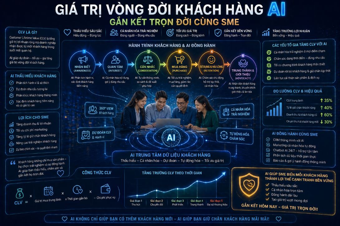 Trong kinh doanh, Giá trị vòng đời khách hàng AI là thước đo của sự thành công bền vững. Đối với SME, việc tìm kiếm khách hàng mới thường tốn kém hơn giữ chân khách hàng cũ. Một doanh nghiệp thấu cảm không coi khách hàng là những con số doanh thu. Bạn coi họ là những người bạn đồng hành trên suốt chặng đường phát triển.