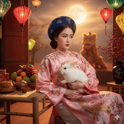Keep my real face exactly the same as in the uploaded photo, do not change any facial features. A cinematic half-body portrait during the Mid-Autumn Festival with a bright, radiant background. A beautiful young Vietnamese woman sits gracefully, leaning slightly against a bamboo table. One hand rests gently on the edge of the table, while the other cradles a real fluffy white rabbit close to her chest. Her posture is relaxed yet elegant, with her gaze softly turned into the distance, blending allure and refinement. She wears a traditional Áo Nhật Bình in pink silk, embroidered with intricate floral and phoenix patterns. The robe has a wide rectangular collar with overlapping panels, and long flowing sleeves that convey elegance and dignity. Her makeup is soft and refined, with natural tones and red lips. Her dark brown hair is styled in a neat low bun, neatly framed by a deep royal blue circular khăn vành hat. In front of her, the bamboo table displays golden mooncakes, a tray of colorful fruits, and a traditional brown ceramic teapot set. In the brightly illuminated background, glowing lanterns in red, yellow, and green shine vividly, a black lacquer vase filled with peach blossoms and red berries decorates the festive setting, and the silhouette of a lion dance performance takes place under the radiant full moon. The warm, glowing atmosphere feels dreamy, celebratory, and cinematic. Ultra-realistic 4K, half-body composition, sharp details, radiant festival lighting, bright dreamy background with rich red and golden tones.