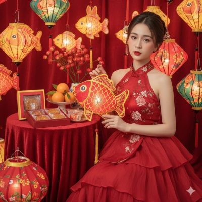 Keep my real face exactly the same as in the uploaded photo, do not change any facial features. A young girl in a traditional Asian festive setting, sitting gracefully beside a red-covered table with mooncakes and fruits. She wears a flowing layered red halter dress with floral patterns, styled with elegant fabric layers. Her makeup is refined with bold red lips and soft blush, and her hair is styled in vintage-inspired buns. Keep the face and expression from the uploaded photo . She holds a large, decorative red fish lantern with golden edges in both hands. Around her are colorful lanterns shaped like fish and rabbits, glowing warmly. The whole scene is rich in red and gold tones, festive, and reminiscent of Mid-Autumn Festival. Her skin is fair and smooth, glowing under soft warm light, adding contrast to the vibrant background.