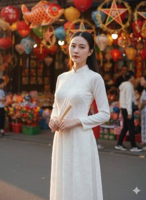 Keep my real face exactly the same as in the uploaded photo, do not change any facial features. A festive outdoor portrait of a young Vietnamese woman at a Mid-Autumn Festival market. She has a slim and graceful figure, with fair, luminous white skin that enhances her elegance. She wears a long flowing white áo dài with delicate floral embroidery. In her hands, she holds a traditional folding fan, positioned elegantly at her waist. Her straight dark hair is styled simply, flowing down over one shoulder, highlighting her refined look. The background is filled with colorful Mid-Autumn lanterns, including red and gold fish-shaped lanterns, star lanterns, and other festive decorations, creating a lively and joyful atmosphere. The lighting is warm golden hour sunlight, casting a soft glow on her fair skin and outfit, while enriching the vibrant colors of the lanterns. Use the exact face from the uploaded image, preserving all natural features and expression accurately.”,