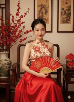 Keep my real face exactly the same as in the uploaded photo, do not change any facial features. Portrait of a young woman in modern traditional attire. She sits gracefully on a wooden chair, holding a red folding fan in her hands. She wears a silk halter top with classic floral patterns, paired with a flowing bright red skirt. Her long black hair is braided neatly, and her delicate face retains the same gentle expression as the reference photo. The background is set in a traditional Lunar New Year atmosphere, featuring a large vase of red peach blossoms, classic decorative paintings, and a few ornamental red carp figures. The scene is lit with soft studio lighting, in the style of festive New Year artistic photography. Ultra-detailed, 8K quality, realistic and vibrant.