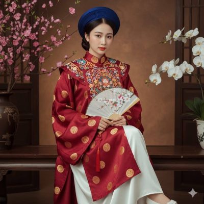 Keep my real face exactly the same as in the uploaded photo, do not change any facial features. Ao Nhật Bình attire in deep crimson silk, with the fabric adorned with evenly spaced golden circular patterns. The outer robe features a wide rectangular collar, with overlapping front panels forming a large rectangular block across the chest. The collar is embroidered with intricate multicolored floral and traditional motifs, creating a striking highlight at the front. The robe is wide-cut with long, flowing sleeves, evoking dignity and elegance. Inside, she wears long white silk trousers paired with simple white fabric shoes, maintaining a refined look. She holds a folded white paper fan decorated with peach blossoms and white flowers. Her makeup is soft and graceful, with natural tones and red lips. On her head, she wears a deep royal blue circular khăn vành hat, neatly framing her low bun. The entire outfit conveys sophistication, solemnity, and timeless elegance, true to the traditional Áo Nhật Bình style of the past. Behind her is a classical Asian background with peach blossoms and white orchids, creating a refined and graceful atmosphere. Studio lighting, high resolution, cinematic portrait style.