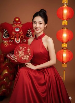 Keep my real face exactly the same as in the uploaded photo, do not change any facial features. She around 24 years old, sitting gracefully on a chair, wearing a long flowing red halter-neck gown, exuding elegance and charm. She has a fair complexion, an oval face, bright sparkling eyes, and a radiant smile with soft red lips. Her hair is styled in a neat high bun with a few loose strands framing her face, makeup is delicate with emphasis on her lips and eyes. She holds a traditional round red hand fan with golden floral patterns, adding a touch of cultural grace. Behind her is a vibrant red lion dance head with large expressive eyes, symbolizing festive celebration. To the side, glowing red lanterns hang vertically, casting a warm and enchanting light. The overall atmosphere blends modern beauty with traditional Asian festival vibes, creating a captivating, confident, and elegant portrait. High resolution, studio lighting, vivid colors, cinematic composition