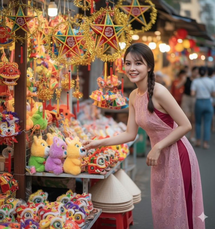 A charming full-body photograph of a young Vietnamese woman, smiling brightly at the camera while standing at a bustling street stall filled with colorful Mid-Autumn Festival toys. She is wearing an elegant, modern style Áo yếm (traditional Vietnamese halter top) dress in soft pink with delicate butterfly cutouts. Her long dark hair is neatly styled in a side braid. She is reaching out to touch or examine one of the fluffy animal plush toys displayed on the stall, with a joyful and curious expression. The stall is overflowing with a wide variety of traditional toys, including intricate paper lanterns, cute animal plushies, and other festive decorations. The background is a blur of vibrant market activity and more colorful lanterns, indicating a lively festive environment. Maintain 100% fidelity to the uploaded face. Soft natural light, shallow depth of field, photorealistic, high detail. Keep my real face exactly the same as in the uploaded photo, do not change any facial features.