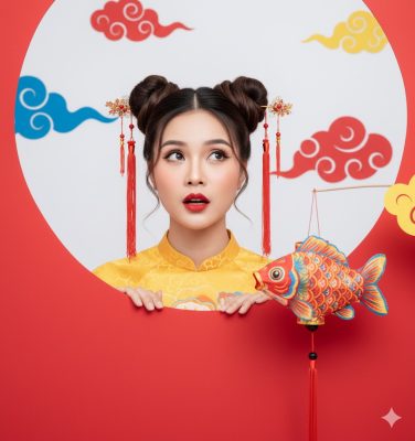 Keep my real face exactly the same as in the uploaded photo, do not change any facial features. A captivating half-body portrait of a beautiful young Vietnamese woman peeking over a vibrant red curved prop. Her dark hair is styled in two elaborate high buns with decorative pins and red tassels. Her makeup is bold with dramatic eyeliner, long lashes, and red lips, and she has a slightly surprised or curious expression, looking upwards. A colorful, intricately designed paper fish lantern hangs from the red prop beside her. The background is a clean white wall adorned with stylized paper clouds in red, blue, and yellow. Studio lighting, high fashion editorial style, photorealistic, ultra-detailed.