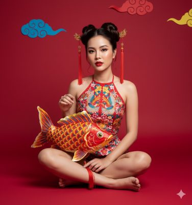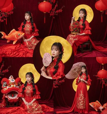 – **Top Left:** She is gracefully seated amidst flowing red fabric, with a large decorative orange koi fish nearby and a red paper lantern. She looks serenely to the side.