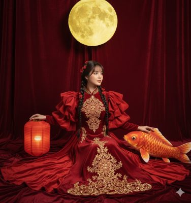A full-body photograph of a beautiful young Vietnamese woman sitting gracefully on a flowing rich red fabric. She is wearing an elaborate red traditional-inspired gown with ruffled sleeves and intricate embroidery. Her long, dark hair is styled in two elegant braids adorned with small red ornaments. She looks serenely towards the side, away from the camera. Beside her, there’s a large decorative orange koi fish prop and a red paper lantern. The background is a deep red velvet-like drape with a stylized yellow full moon prop at the top. Cinematic photography, rich color palette, dramatic lighting, high fashion editorial style, ultra-realistic, hyper-detailed. Keep my real face exactly the same as in the uploaded photo, do not change any facial features.