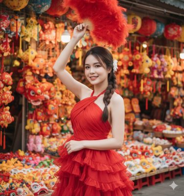 A vibrant half-body portrait of a beautiful young Vietnamese woman, striking a confident pose. She is wearing a stunning, modern red dress with intricate ruffled layers, featuring a halter neckline. Her dark hair is elegantly styled in a long side braid, adorned with a delicate white flower clip. She holds a large, fluffy red feather fan gracefully above her head, with her arm raised. She looks directly at the camera with a soft, engaging smile. The background is a bustling and colorful market stall, richly decorated with an abundance of traditional Mid-Autumn Festival lanterns and toys in warm tones of red and yellow, creating a lively and festive atmosphere. The scene is bathed in bright, clear daylight. Vibrant colors, festive atmosphere, shallow depth of field, photorealistic, high detail. Keep my real face exactly the same as in the uploaded photo, do not change any facial features.