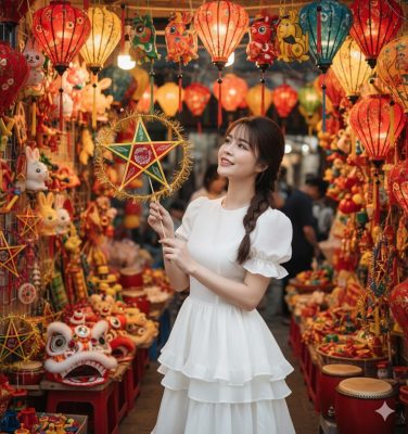 A captivating full-body photograph of a beautiful young Vietnamese woman standing in a vibrant, richly decorated stall for the Mid-Autumn Festival. She is wearing a modern, elegant white dress with ruffled layers, and her dark hair is styled in a single neat braid. She is looking upwards and slightly to her right with a gentle, appreciative expression, holding a traditional paper star lantern on a stick with both hands, as if admiring it. Around her, the stall is brimming with an overwhelming array of colorful, traditional Mid-Autumn lanterns and toys, including intricate paper fish, red and yellow lion dance heads, and various other festive decorations. The scene is illuminated by warm, inviting lights from the lanterns, creating a cheerful and bustling atmosphere. In the blurred background, another person is visible, adding to the market’s activity. Vibrant colors, festive lighting, shallow depth of field, photorealistic. Keep my real face exactly the same as in the uploaded photo, do not change any facial features.