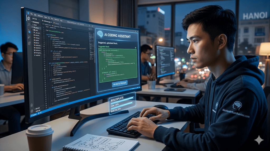 GitHub Copilot — công cụ AI hỗ trợ viết code của Microsoft/GitHub — đang được sử dụng bởi hơn 1,3 triệu developer trên toàn thế giới. Các nghiên cứu của GitHub cho thấy developer dùng Copilot hoàn thành tác vụ nhanh hơn 55% so với không dùng. Với Cursor — IDE tích hợp AI — lập trình viên có thể mô tả yêu cầu bằng ngôn ngữ tự nhiên và nhận về code hoàn chỉnh, được review tự động và sẵn sàng deploy.