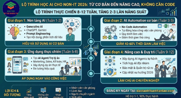 Lộ trình học AI cho Non-IT 2026 chi tiết từ cơ bản đến nâng cao, không cần biết code. Khóa học thực chiến giúp nhân viên văn phòng, lãnh đạo, người chuyển ngành làm chủ Generative AI & AI Automation chỉ trong 8-12 tuần tại daotaotrituenhantao.com.
