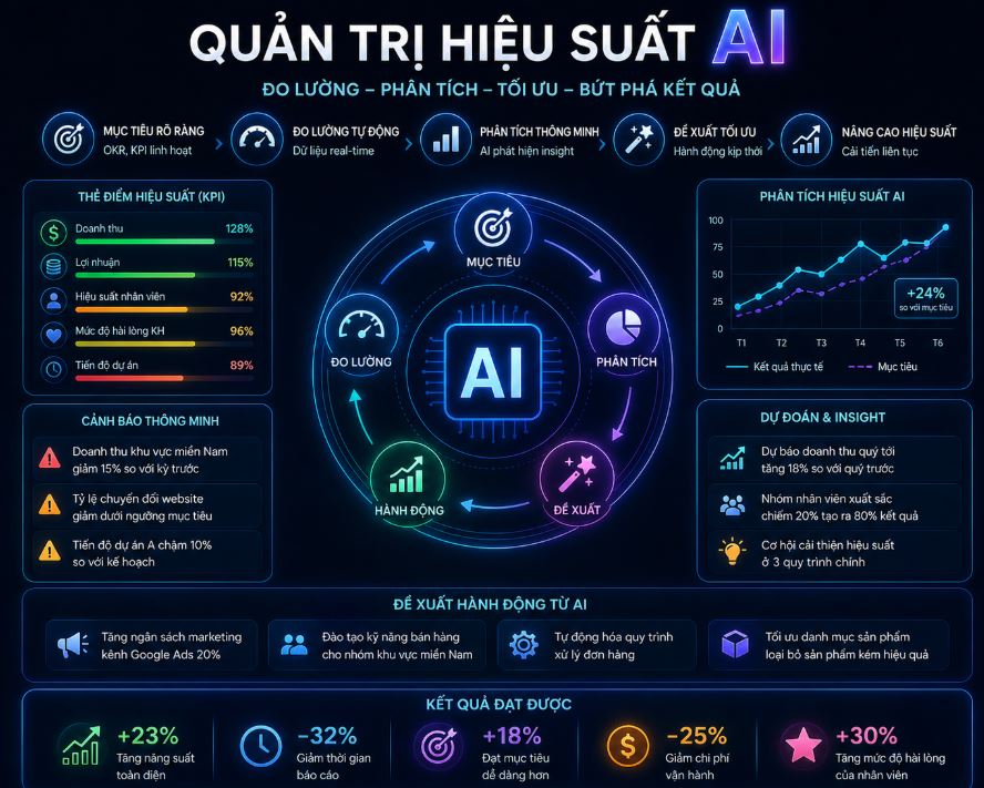 Nhận diện điểm nghẽn hiệu suất: AI cảnh báo nếu một quy trình đang quá tải hoặc một cá nhân đang gặp trở ngại thường xuyên. Thay vì chỉ trích, lãnh đạo có thể cùng AI đưa ra các gợi ý đào tạo hoặc điều chỉnh khối lượng công việc. Sự đồng hành này giúp nhân viên cảm thấy luôn được bảo vệ và quan tâm.