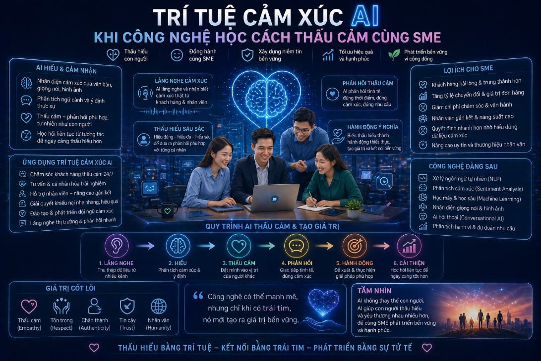 Ứng dụng Trí tuệ cảm xúc AI giúp SME khẳng định tầm vóc của một doanh nghiệp tử tế. Nó giúp bạn bứt phá bằng sức mạnh của tình yêu thương và sự thấu hiểu. Khi công nghệ có “trái tim”, doanh nghiệp của bạn sẽ trở nên bất diệt.