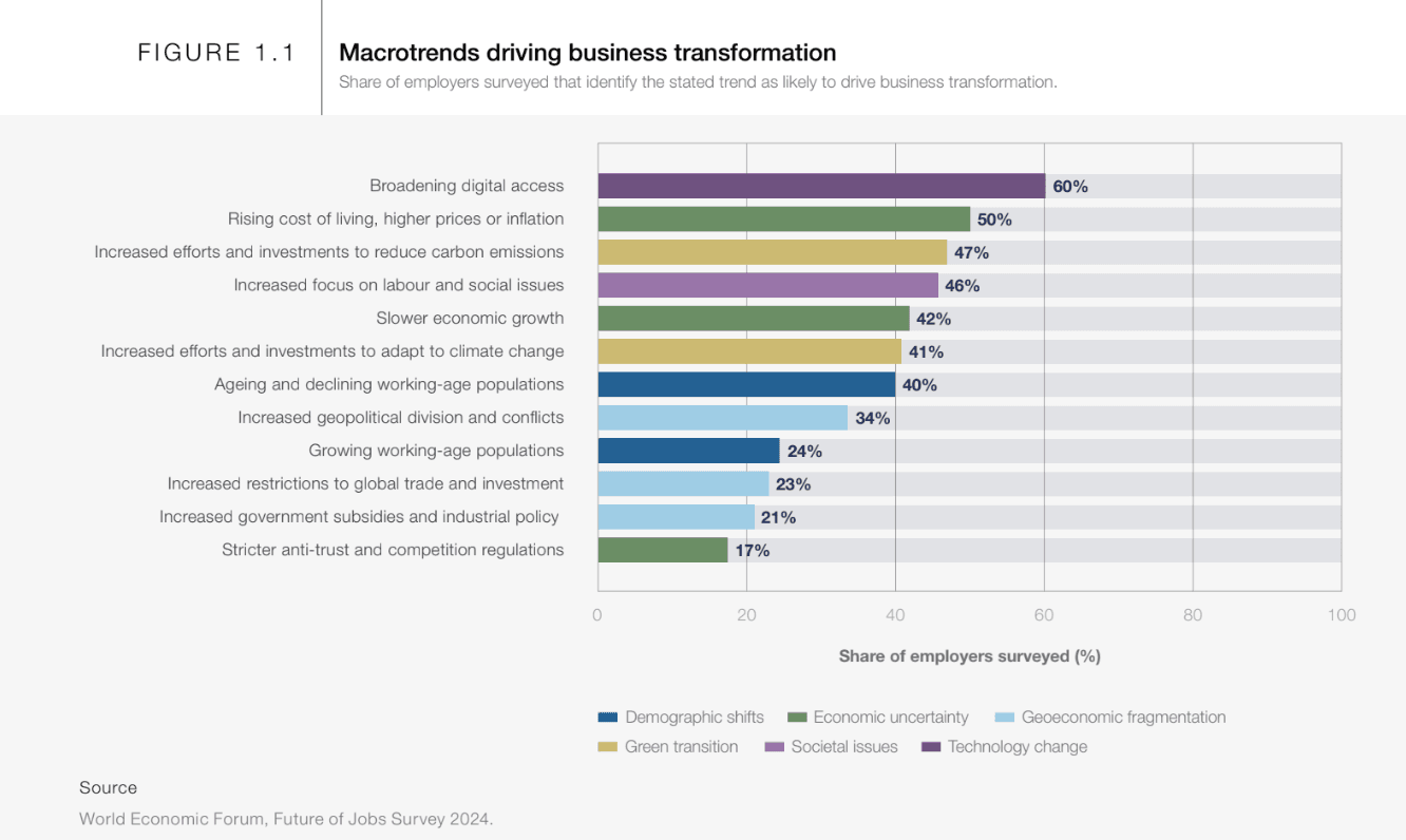 Trong số các xu hướng này, sự tiến bộ của công nghệ, đặc biệt là Trí tuệ nhân tạo (AI) và công nghệ xử lý thông tin, được dự đoán sẽ có tác động chuyển đổi lớn nhất, với 86% các nhà tuyển dụng kỳ vọng AI sẽ thay đổi hoạt động kinh doanh của họ vào năm 2030 (Hình 1). AI không chỉ tạo ra các công việc mới phát triển nhanh nhất mà còn góp phần vào sự suy giảm của một số vai trò truyền thống.