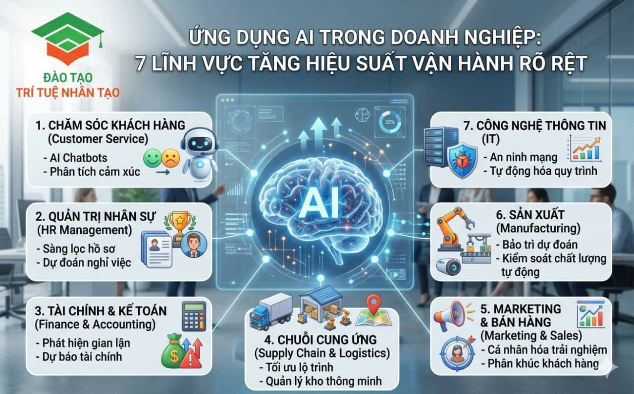 Ứng dụng trí tuệ nhân tạo trong doanh nghiệp đang trở thành xu hướng quan trọng giúp tổ chức nâng cao hiệu suất vận hành và thích nghi với môi trường kinh doanh số.
